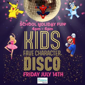FREE Kids Disco these School Holidays & it’s a dress up YAYYYYYYY! This Friday, July the 14th from 4 to 6 pm at Plateau Sports